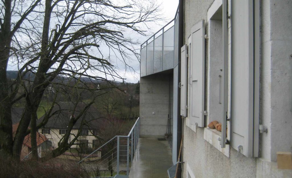 Für den Künstler Caspar Abt wurde ein neues Atelier an sein Wohnhaus in Grandfontaine angebaut. Auf den Grundmauern eines ehemaligen Schopfes wurde ein roher Beton Metall Körper gesetzt, der sowohl innen wie auch aussen unbehandelt gelassen wurde und ein Ort der Arbeit und Kontemplation schafft.