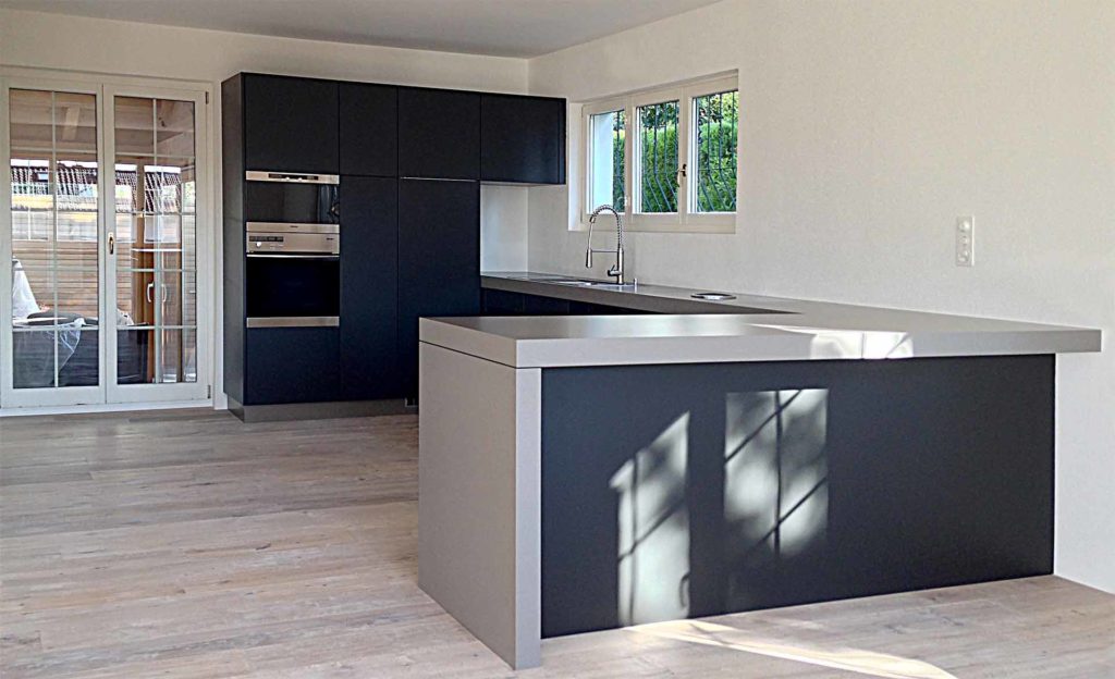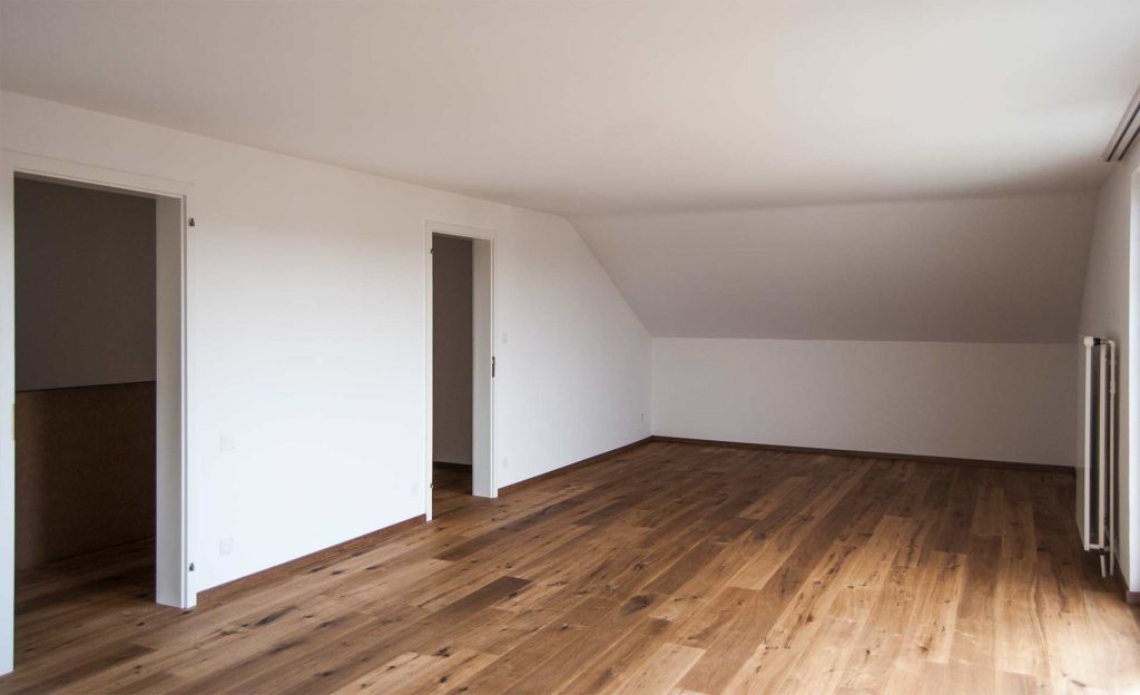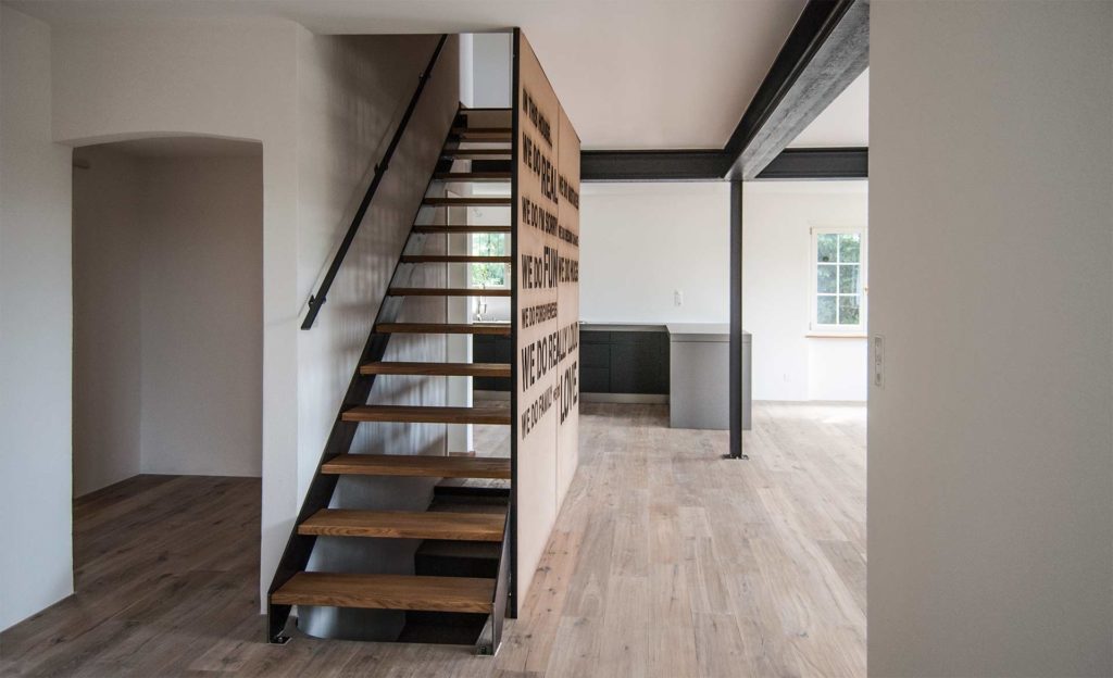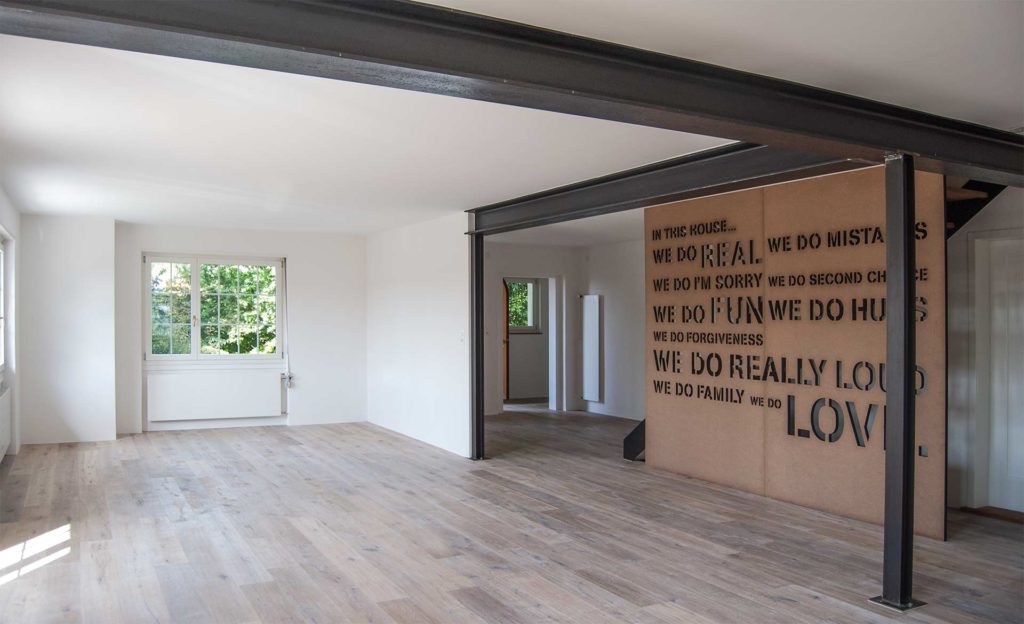 Für eine fünfköpfige junge Familie wurde das Elternhaus den neuen Bedürfnissen nach grosszügigkeit und durchgängigkeit angepasst und dadurch angeeignet. Tragende Wände wurden durch Stahlträger ersetzt, die gewachst die rohe materialität behalten. Der Parkett aus Eiche, weiss lasiert und geölt und die Absturzsicherung mit einem gelaserten Schriftzug unterstützen diese rohe materialisierung der neuen Einbauten und schafft einen spannenden Bezug zwischen neu und alt.