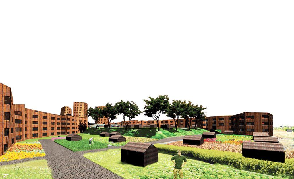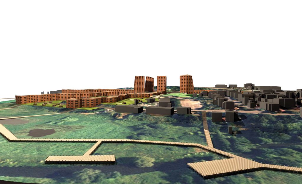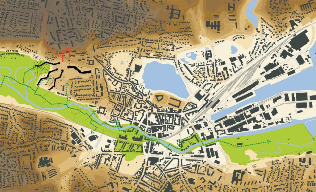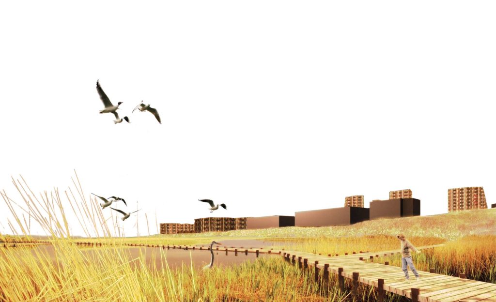 Im Rahmen des 10.Europan Wettbewerbes wird in Kolding [DK] eine neuer Stadtteil geschaffen, der sowohl dicht ist und ein maximum an Privatsphäre erlaubt. Die städtische Makrostruktur wird an der Fassade auf den auf menschlichen Massstab heruntergebrochen. Die eckige Konzeption der Gebäude formt interessante äussere Räume und vermeidet frontale gegenüber. Das Projekt fördert Fussgänger- und Radverkehr und bietet attraktive Verbindungen in das Stadtzentrum. Der motorisierte Verkehr wird auf ein Minimum reduziert: Autos verkehren auf dem zentralen Platz oder in der Tiefgarage . Die Schrebergärten sind ein wichtiger Teil des neuen Stadtteils. Sie bieten eine Plattform für den gesellschaftlichen Austausch und die Lebensqualität des Quartiers. Dazu dienen sie als Verbindung des städtischen Raumes mit dem Naturraum des Flusses. Das Potential des Flusses und der Auenlandschaft als wertvolles Naherholungsgebiet wird durch ein Netzwerk von hölzernen Stegen erlebbar gemacht, ohne das Ökosystem gross zu beeinflussen.