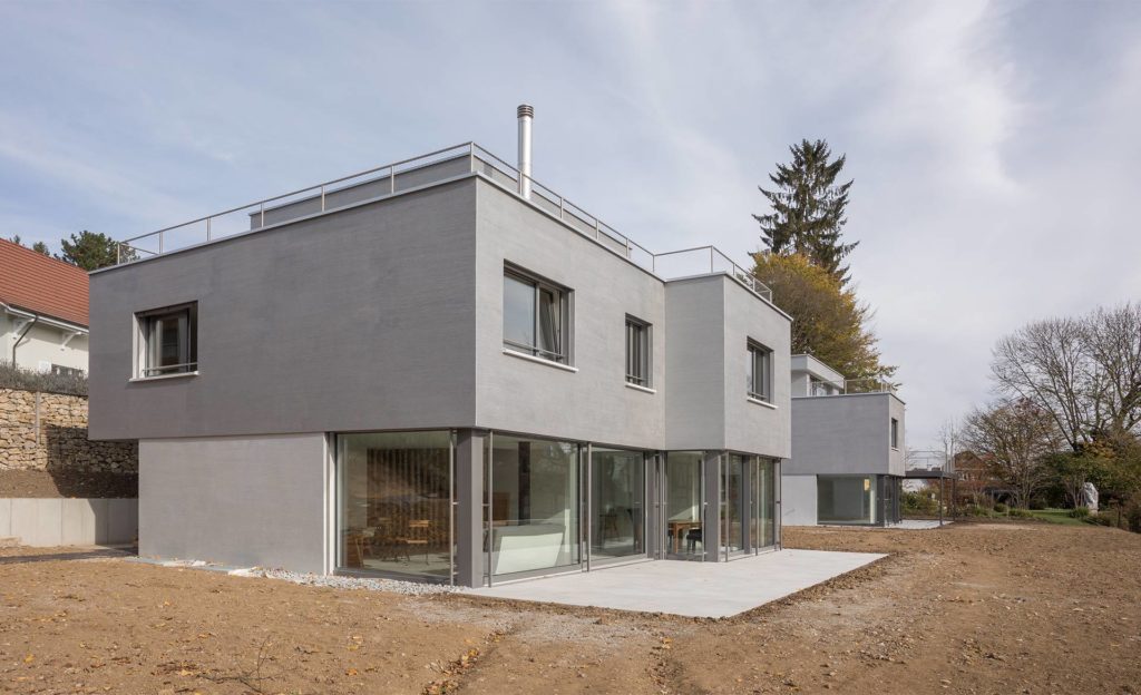 Angrenzend an die von Fachwerkbauten geprägte Kernzone werden auf einem grosszügigem Grundstück zwei Häuser für die Familien von zwei Brüdern geplant. Gewünscht wurde jeweils ein Haus im Garten, eine Optimierung der Gartenfläche und eine starke Präsenz der Natur im Inneren der Häuser.