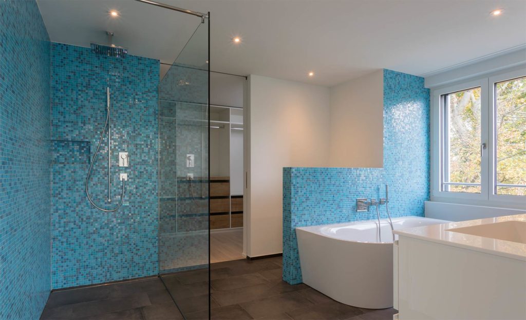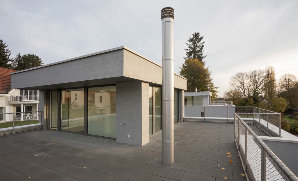 Im Attika öffnet sich der Raum nochmals und bietet eine phantastische Rundumsicht. Vorgelagert ist ein Sitzplatz für die letzten Sonnenstrahlen des Tages.